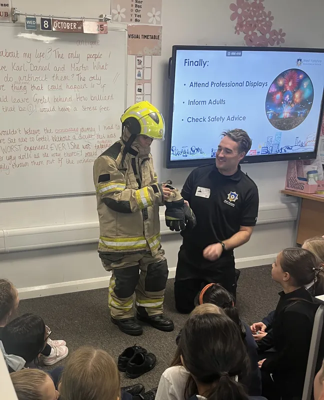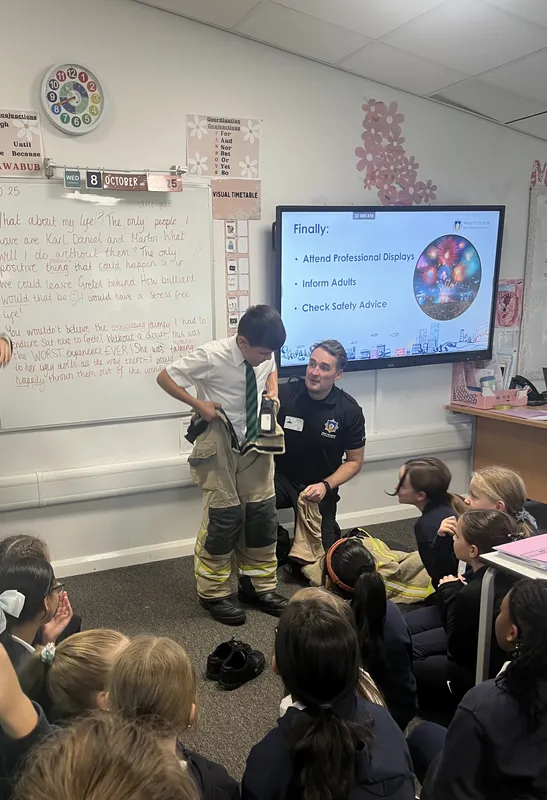 Firefighters from Odsal Fire Station visited Year 6 today to talk about safety around Bonfire Night.